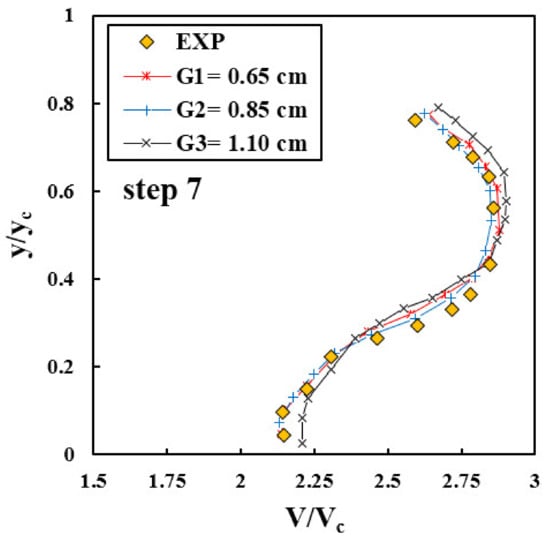 The resulting apparent order of the model was 3.46 and the maximum GCI value for the velocity profiles over step 7 was 5.04%, corresponding to 0.12 m/s. In addition, experimental data obtained from Felder et al. [18] were used to verify the numerical results by comparing the velocity distributions as functions of the dimensionless water depth y/yc (here, y is the water depth on the step) against the dimensionless velocities V/Vc (here, Vc is critical velocity Vc = (g × yc)0.5) over flat steps 8, 9, and 10, as shown in Figure 6. The maximum values for the relative error for steps 8, 9, and 10 were 6.25%, 5.25%, and 6.35% for Q = 0.113 m3/s and 6.42%, 5.33%, and 6.21% for Q = 0.090 m3/s, respectively. The maximum level of consistency between the numerical and experimental model was in the middle area of the depth up to the flow surface, indicating a high degree of accuracy of the numerical simulation.