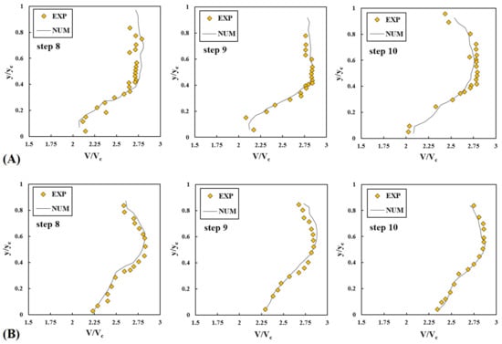 Dimensionless interfacial velocity distributions of the flat stepped spillways; numerical simulation vs. experimental data (A): Q = 0.113 m3/s; (B): Q = 0.090 m3/s.