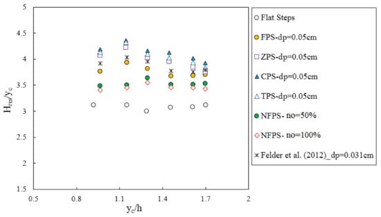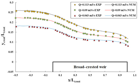 The numerical model was also validated through the experimental data obtained from Felder et al. [18] by comparing the free-surface profiles as functions of the dimensionless water depth ycrest/Lcrest over a broad-crested weir for three different discharges. As shown in Figure 7, the simulated water surface profiles over a broad-crested weir length (Lcrest) were very similar to the experimental values. The mean relative error percentage of the flat stepped spillway was 4.85%. This figure indicates that the numerical results were fairly consistent with the experimental results. In addition, the numerical model was able to simulate the flow patterns with different discharges to an acceptable level.