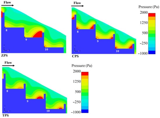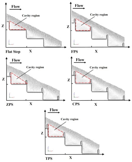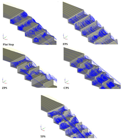 Figure 8 shows the streamlines of different pool configurations steps. It can be seen that the streamlines are parallel to the axial plane in the flat and FPS steps. When we used the pooled step, the water flow caused collisions near the pool and the aggregation of the streamlines increased. In ZPS and CPS configurations steps, the streamlines were not parallel to the axial plane, which meant that in the parts of steps with pool aggregation, the streamlines were more intense, while in the parts without pool aggregation, the streamlines aggregation decreased.