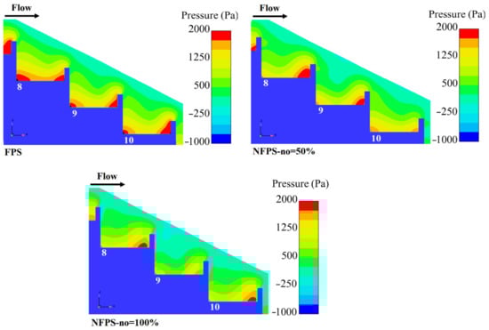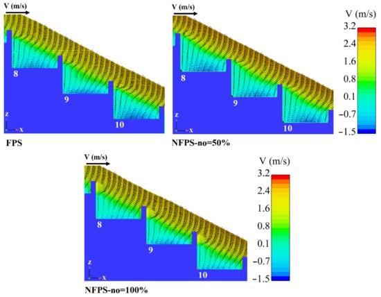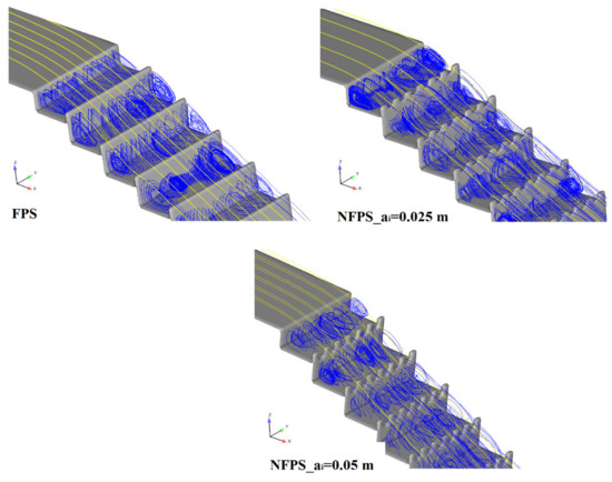 Figure 10 displays the streamlines of the notch of the pooled steps with ai = h/4 (no = 50%) and h/2 (no = 100%), and the results were compared with the pooled step (no = 0%). It can be seen that the streamlines do not show significant changes in the axial plane between the pooled steps and the notch of the pooled steps. When we used the notch of the pooled steps, the aggregation of the streamlines, due to the passage of some vortexes of the notch, decreased.