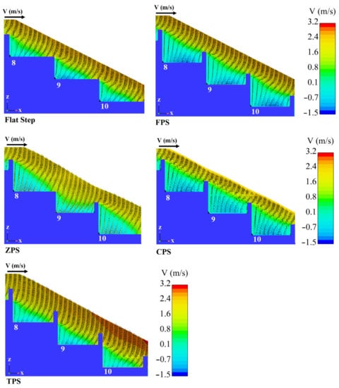 Differences in the movement of the streamlines affected the free water surface. In other words, the free water surface was horizontal in flat and FSP steps, however in ZPS, CPS, and TPS, standing sidewall waves were formed on the free water surface. According to Felder et al. [18], standing sidewall waves depend on the flow discharge and pool configurations in the flow over stepped spillways. Figure 9 highlights the streamlines on the representative steps in each configuration. As can be seen, as with the flat stepped spillway, the flow surface over the pool weir was approximately parallel to the pseudo-bottom formed by the pool edges, although ZPS, CPS, and TPS presented some instabilities caused by the staggered configurations.