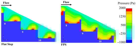 Negative pressures can be observed in the flat stepped spillway—the maximum values occurred in the upper part of step wall on the vertical face of the step. For all proposed configurations (pooled and flat), pressure values near the steps were never negative—the cavitation phenomenon is more likely to occur on the vertical face of the step. The pooled steps, having fewer areas with negative pressures, are therefore less subject to cavitation. With regard to the Figure 15, it could be seen that with the notched pool, the maximum pressure values decreased near the step pool.