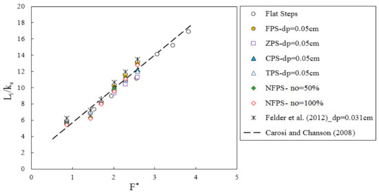 The determination of the inception point is a key aspect for the delineation of aerated and non-aerated regions and for the appropriate design of walls and stilling basins [52]. The locations of the inception points of free-surface aeration were calculated for all configurations and are presented in dimensionless terms as Li/ks as a function of the Froude number F* in Figure 16. Herein, Li is the longitudinal distance from the first step edge to the inception point location and ks = (h + dp) × cosθ (in Flat step, dp = 0) is the roughness height. The Froude number F* is defined in terms of the step roughness: