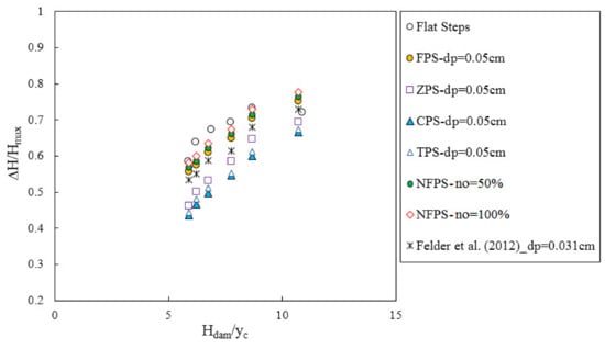 Knowledge of the energy dissipation and residual energy efficiency is fundamental for engineering designs. The rate of energy dissipation and the residual energy were calculated herein at the edge of the last step for all stepped spillway configurations. According to Li and Zhang [54] and Ghaderi et al. [39], the relative energy dissipation (ΔH/Hmax) expresses the percentage of total energy loss along the stepped spillway relative to the upstream total head, Hmax. The total head can be evaluated as: