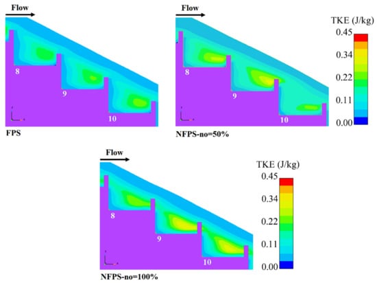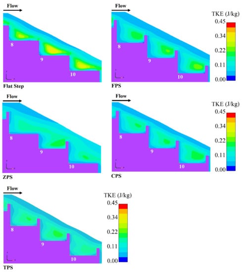 Turbulent kinetic energy (TKE) is formed in the spillways due to the high gradient of velocity [56]. Taking into consideration the fact that the change process of the TKE was the same for all discharges, only the results related to discharge 0.090 m3/s are shown in Figure 19. It could be seen in this figure that the maximum TKE was created on flat steps rather than the different pooled step configurations. In contrast to the flat configurations, the maximum turbulent kinetic energy occurred in the middle of the horizontal step surface, while the maximum turbulent kinetic energy occurred near the step pool. The value of the TKE also increased along the spillway, which was similar to the results of previous studies, such as that by Bombardelli et al. [56]. The region of turbulence on the FPS was greater in intensity than for other types of pooled steps. With regard to Figure 20, it can be seen that with notched pools, the maximum TKE values increased near the step pool.