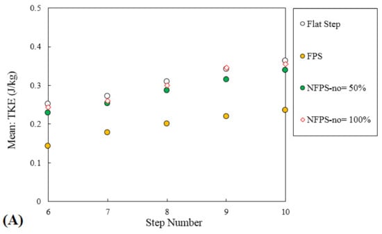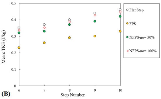 The mean TKE (J/kg) values on pooled steps of different configurations (height and notched): (A) Q = 0.090 m3/s; (B) Q = 0.105 m3/s.