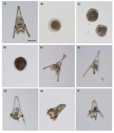 Examples of (B) fertilized eggs, (C,D) malformed blastulae, and (E–I) malformed plutei after exposure of fertilized eggs of P. lividus to PAHs and Cu, with respect to (A) the control, embryos deriving from fertilized eggs grown without PAHs and Cu. Scale bar = 50 μm; Leica DMi6000 B inverted microscope.