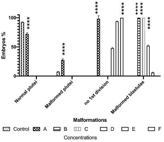 P. lividus exposed to Cu. Percentage of normal plutei, malformed, plutei, and eggs with arrest of the first mitotic division. Malformed blastulae were produced when newly fertilized eggs were exposed to Cu at the six concentrations tested (A, 0.01; B, 0.05; C, 0.1; D, 0.3; E, 1.0; and F, 5.0 mg/L) in comparison to controls, represented by newly fertilized eggs tested in FSW. The statistical significance of differences between test groups and controls is reported as follows: **** p < 0.0001).