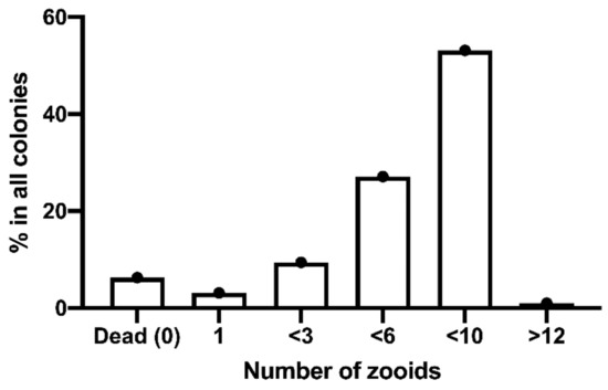 A range of development times was recorded at 18 °C, from the metamorphosis of the tadpole-like larva (first oozoid) up to the production of a colony made of several blastozooids (Figure 5). In four weeks, 53.1% of total metamorphosed oozoids formed colonies containing 8–10 blastozooids; 27.1% formed colonies containing 4–6 blastozooids; 9.4% formed colonies containing 2–3 blastozooids. However, the remaining 3.1% oozoids developed into a single bud, neither doubling nor producing a growing colony. In addition, a small percentage of oozoids (1.04%) produced a colony containing more than 12 blastozooids (and up to 16) in 4 weeks. The total percentage of dead oozoids (either immediately after metamorphosis or after developing in the first blastozooid) not producing colonies was 6.3%. Accordingly, the largest frequency classes, i.e., those containing colonies of 4–6 and 8–10 zooids, were used for in vitro tests of pollutants.