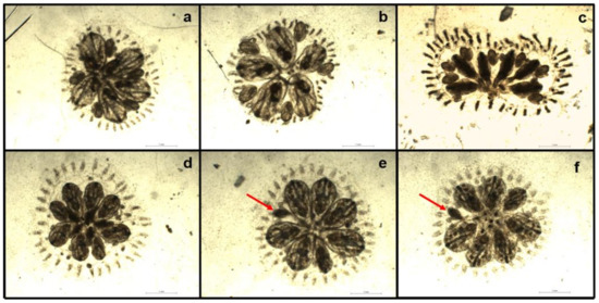 Colonies of B. schlosseri treated with PAHs to show a range of possible morphological reactions and their classification according to health scores. (a) Control at t24; (b) concentration 19.2 × 105 µg/L at t24, showing a score 1 colony; (c) concentration 19.2 × 105 µg/L at t48, showing a score 3 colony; (d) concentration 19.2 × 104 µg/L at t24; (e) concentration 19.2 × 104 µg/L at t48 showing most zooids in the good state (score 1) and one malformed zooid (red arrow); (f) same colony as in (e) observed by the opposite site of the acetate. Both (e) and (f) show a zooid in a phase of re-absorption (red arrow).