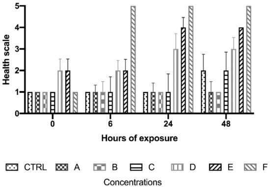 The administration of copper to B. schlosseri colonies induced dose-dependent effects. Health conditions of animals (as referred to scores indicated in Table 2) were stable within the duration of the experiment at three lower doses (0.01, 0.05, and 0.1 mg/L). The lower doses did not trigger negative effects within 48 h (Figure 7) and the state of health of colonies was comparable to that of control colonies (score 2). However, a progressive deterioration was observed at higher concentrations. In fact (Figure 8b), all specimens treated at the highest concentration (5.0 mg/L) died. In particular, the administration of 0.3 mg/L of Cu induced stress (score 3) at t24 and t48 (Figure 8a–d).