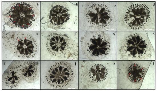 Colonies of B. schlosseri exposed to Cu ions. Colonies exposed to 0.3 mg/L at t24 (a) and at t48 (b); colonies exposed to 0.3 mg/L at t24 (c) and at t48 (d); colonies exposed to 1.0 mg/L at t24 (e) and at t48 (f); colonies exposed to 1.0 mg/L at t24 (g) and at t48 (h); colonies exposed to 5.0 mg/L at t24 (i); colonies exposed to 5.0 mg/L at t24 (j); control colonies (pure medium, without Cu) under take-over at t48 (k,l). White arrows in panel (k) indicate reabsorbed adults. Red arrows in (a,l) indicate open and actively filtering inhalant siphons. White scale bars: 1 mm.