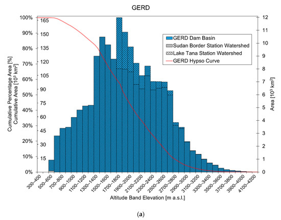GERD dam will be the largest dam build in Africa hitherto. The installed power will be 6000 MW, with an annual production of 15.7 TWh. The dam’s crest will be at 675 m a.s.l., and the maximum operation level will be 640 m a.s.l. The lake level will change between 590 and 640 m a.s.l. The reservoir volume will be 74 Gm3, with operation volume of 59 Gm3. The maximum turbine discharge is 4305 m3 s−1, split between 16 turbines of 375 MW each (as described by [3,29,30]). Average annual temperature of the Blue Nile catchment (168 × 103 km2, the hypsographic curve is presented in Figure 2) closed at the dam during 1965–1988 was +12 °C, with a minimum of +3 °C and maximum of +18 °C. The warmest period is March–August. Mean annual precipitation was 1500 mm year−1, with largest rainfall between June and September.