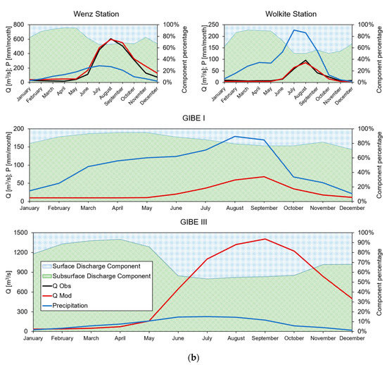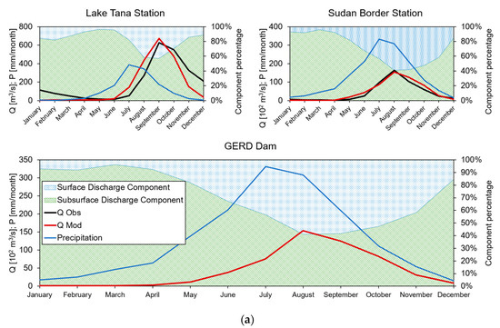 Monthly flows during the calibration period (1965–1988), at dam sites and river discharge stations. (a) Blue Nile basin, GERD. (b) Omo basin, GIBE. We also report flow components (surface/subsurface).