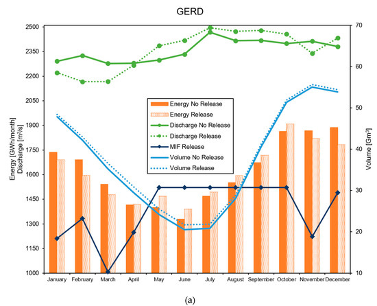 As seen in Figure 4a for GERD plant, water release in option S2 has in practice little influence on, likely due to the very large size of the reservoir. Energy production, for GERD, follows closely stream flow dynamics, with a greater production during flood season, under S2, the energy production is smaller.