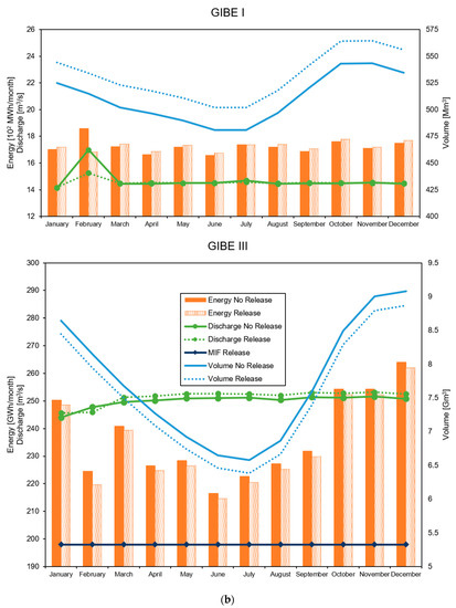 For GIBE III, we considered that Omo river is the greatest tributary of Turkana lake. This is an endorheic lake with high evaporation, mostly laid in Kenya. Therefore, the less water flows within the Omo river, the larger losses occur in the Turkana lake, with large ecological implications. We hypothesized a first scenario, No Release Scenario (S1), with a minimum water release MIF = 25 m3 s−1, as from the original dam’s design [32,33], and no water for Turkana lake. Second, we calculated the mean annual evaporation volume from the lake, and we created a scenario called Environmental Release Scenario (S2), including a proper release during flood period (July–September), to supply the Turkana lake properly (i.e., by calculation of losses from evaporation at a monthly scale retrieved from [39], where an analysis of the different flow and impact was carried out).