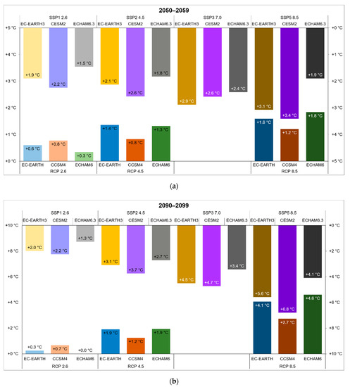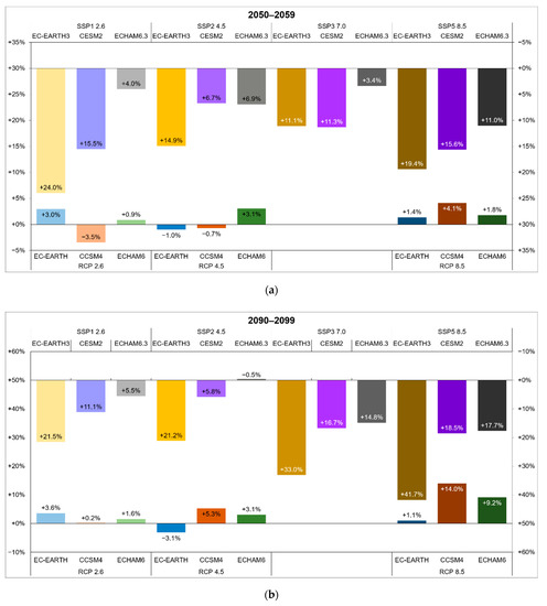 For CMIP5, we used three Representative Concentration Pathways (RCP) [50] that are scenarios of greenhouse gasses concentration trajectories. We used RCP 2.6, a most optimistic scenario, with a +1 °C increase of the mean global temperature at the end of 21st century; RCP 4.5 (+2.2 °C); and RCP 8.5 (+3.7 °C). In CMIP6, Shared Socioeconomic Pathways [51] have been introduced, a combination between CO2 and socioeconomic scenarios and projected socioeconomic global changes until 2100. We used SSP1 2.6, which projects a temperature jump of +2 °C (vs. historical baseline) within 2100 and an increase of forest cover. The SSP2 4.5 uses RCP4.5 and moderate land use. The SSP3 7.0 represents a medium-high increase of emission and intense land use; this scenario was implemented to fill the gap present in the RCP scenarios. The last scenario is SSP5 8.5, projecting large economy growth and emissions, with less attention paid to the environment. Overall, due the combination of the models and IPCC scenarios, we could use a total of 21 climate scenarios.