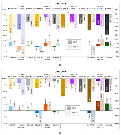 Yearly stream flow changes in GERD and GIBE III. (a) Mid Century P1. (b) End of Century P2.