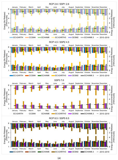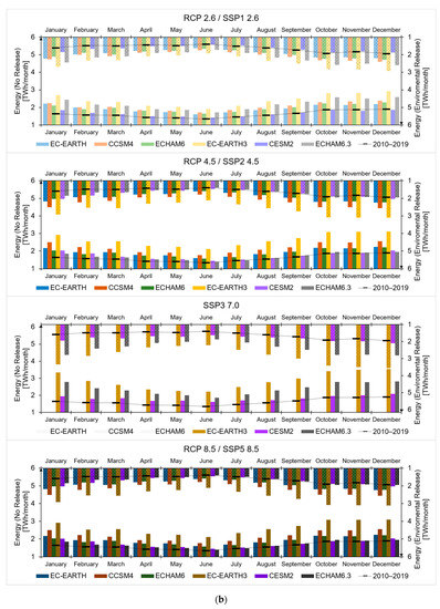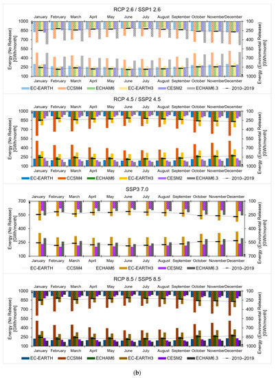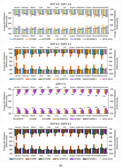 To project forward hydrology, and thence hydropower production in the reservoirs, we used mean daily temperature, and precipitation scenarios from CMIP5 and CMIP6 of the IPCC [40,41]. We used the outputs of three General Circulation Models, namely EC-Earth (European Consortium Earth system model, version 2 for CMIP5 [42] and version 3 for CMIP6 [43]), CCSM4 (Community System Model, version 4 for CMIP5 [44]), CESM2 (Community Earth System Model, version 2 for CMIP6 [45]), and MPI-ESM (European Center Hamburg Model, with ECHAM version 6.0 for CMIP5 [46] and version 6.3 for CMIP6 [47]). These models were chosen based upon former studies, indicating an acceptable coherence with local temperature and precipitation data [48,49]. Accordingly, we added the new models from the same families, used in the CMIP6 to explore scenarios variability and uncertainty.