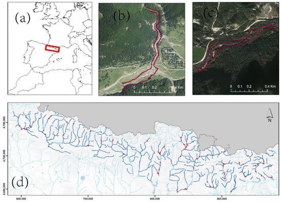 Study area. (a) Location of the analyzed rivers, Pre-Pyrenean and Pyrenean, in Europe. (b,c) Examples of sections, in red, of legal bankfull river boundaries according to national cartography []. (d) Locations of all Pre-Pyrenean and Pyrenean rivers are marked with dark blue, and the locations of all sections in red. Coordinates in meters, EPSG: 25831.