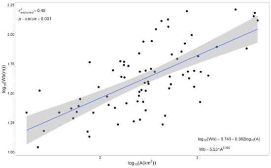 The relationship between the logarithms of Wb and A showed a significant increase in log10 (Wb) with the increase of log10 (A) (Figure 2) (F1,74 = 62.89, p < 0.001, r2adjusted = 0.45). With the linear model coefficients, we calculated α and β values of Equation (2) for our regional data. The regional power law relationship is as follows: