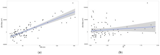 (a) Relationship between the differences between Sb and Sbe in m2 and the real bankfull width (Wb) in m at the 76 studied sections. The blue line shows linear regression (F1,74 = 158.4, p < 0.005, r2adjusted = 0.68) with 95% CI (grey). (b) Relationship between the differences between Sb and Sbe in m2 and the sinuosity index (SI) in m at the 76 studied sections. The blue line shows linear regression (F1,74 = 1.52, p > 0.05, r2adjusted = 0.01) with 95% CI (grey).