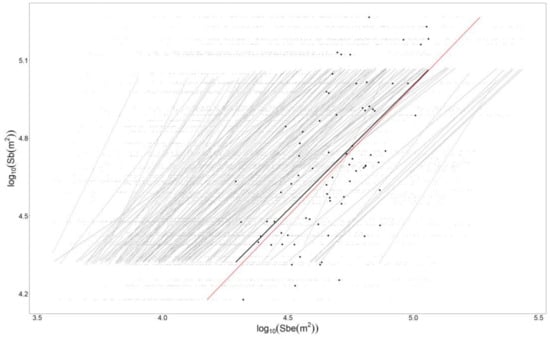 Relationships between log10 (Sb) and log10 (Sbe) in m2 at the 76 studied sections for the Sbe estimated by the different regional curves. The black line shows the linear regression where Sbe was estimated by our regional curve (F1,74 = 51.24, p < 0.001, r2adjusted = 0.40). The red line shows the linear regression considering the Sb values for Sbe. Grey lines show all the different relationships between Sb and the Sbe estimated for the different curves.