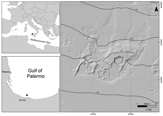 The study area is located along the northwestern coast of Sicily (Figure 1), in a coastal area close to the urban center of the city of Palermo, which was exposed since the mid-20th century to multiple sources of pollution due to chaotic urban planning, improper waste disposal and untreated urban and industrial wastewater. Therefore, the Gulf of Palermo was affected in the past decades by severe trophic alteration of the coastal waters, and high concentrations of P-PO4 (3–45 mmol L−1) and chlorophyll a (2–35 mmol L−1) were recorded during the summer season []. Consequently, significant modification of the structure and composition of the seabed (from mostly rocky to sandy and muddy) and the extensive P. oceanica meadow that grew in this area regressed and residual patches were detected at 7 to 21 m depth [].