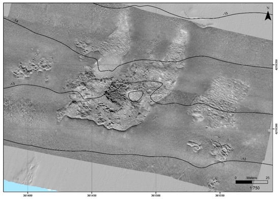 The area investigated by Multibeam is located at a depth of 12.4–15.2 m and covers a surface of about 45,000 m2 (Figure 1), mainly represented by sandy bottoms partly covering with dead matte structures []. A preliminary acoustic (Side Scan Sonar) and underwater scuba diver’s survey highlighted the presence of dead matte, both emerging (about 4850 m2) and partially buried and hidden by ripple marks (about 1350 m2), surrounded by sandy bottoms of different granulometry (Figure 2). Moreover, patches of natural meadow (about 300 m2) and transplanted meadow on the dead matte are recognizable by SSS (Figure 3).