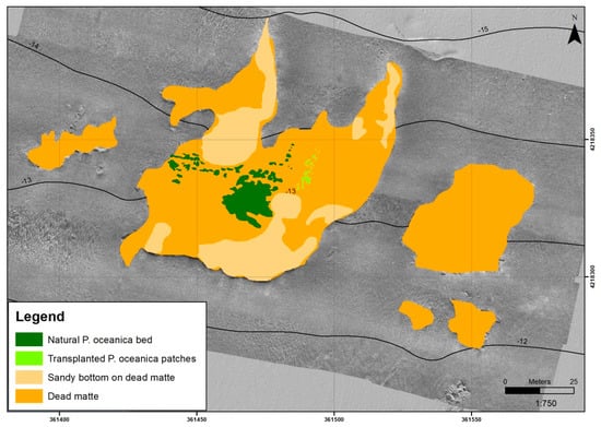 The transplanted site (Figure 1) that was selected using multi-criteria model [] is located on a seabed characterized by dead matte structures []. The topography of the seafloor is irregular and includes dead matte, circular eroded structures delimited by matte walls up to 1 m high and areas with sandy bottoms, which sometimes cover dead matte structures and are, thus, invisible to visual inspection [].