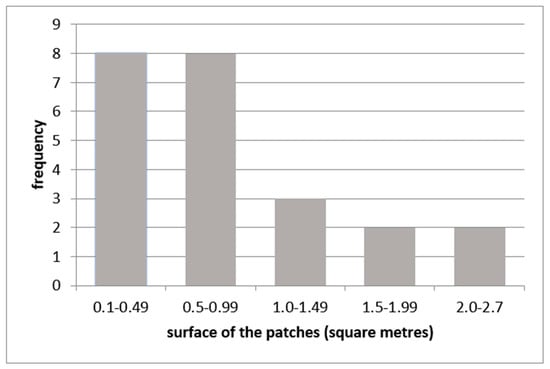 The photo mosaic provides an overall picture of the area, showing the distribution of transplanted patches and several spikes encrusted with bio-fouling; these spikes were used for fixing the initial metal grids on the seabed (Figure 4). The metal grids on which the cuttings were anchored are not visible because they were completely destroyed. It was possible to detect 23 patches of both regular and irregular shape. The patch sizes range from 0.1 to 2.7 m2, covering a bottom surface close to 19 m2. The frequency histogram of transplanted patches shows a positive skewness distribution (Figure 5), with the most frequent class (69.6%) between 0.1–0.99 m2. Moreover, 13.0% of patches range between 1.0–1.49 m2 and 8.7% between 1.5–1.99 m2. The frequency classes between 1.5–1.99 m2 and 2.0–2.7 m2 include only two patches (8.7%) per class, respectively. Larger patches (~30% of cases) have a more irregular shape, probably due to the fusion of several nearby patches.