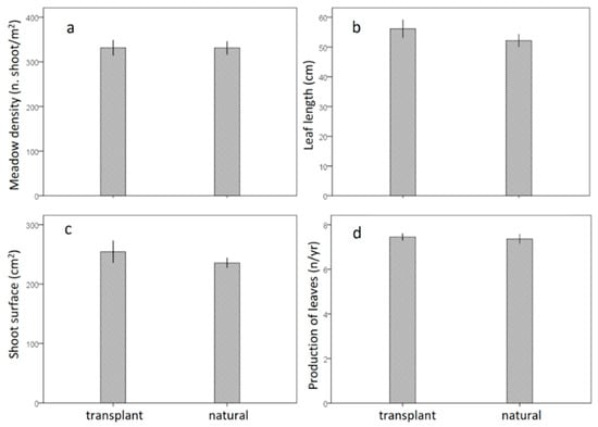 Average shoot density varies from 331.6 ± 17.7 to 331.2 ± 14.9 shoots m−2 (Table 1; Figure 6a), and differences between natural and transplanted beds are not significant (p > 0.05). Leaf length varies from 56.1 ± 3.1 to 52.2 ± 2.2 cm and shoot surface from 254.4 ± 18.7 to 235.6 ± 8.7 cm2 (Figure 6a,b). Considering both variables, non-significant differences are detected (Table 1).