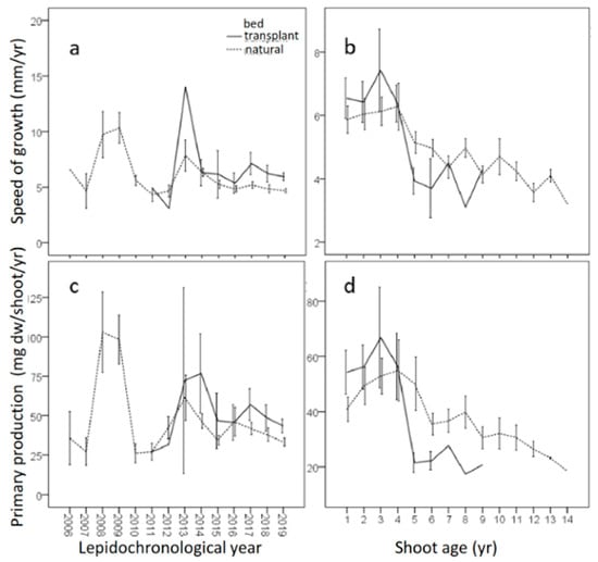 Mean values (SE) of speed of growth (a), primary production (c) across lepidochronological years and shoot age (b,d).