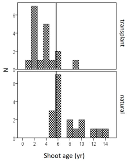 Frequency of shoot age histograms for both beds. The vertical line represents the general mean shoot age.