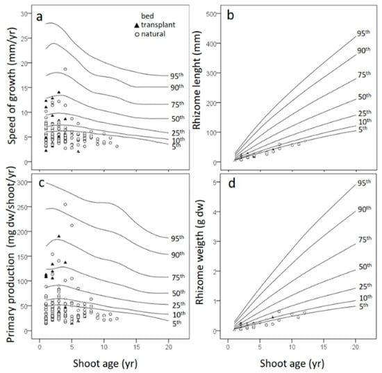 Growth performance measurements plotted on reference growth charts. The distribution of speed of growth of rhizomes (a), rhizome length (b), primary production (c) and weight (d) of the two beds are compared with the expected percentile curves at different ages.