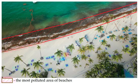 Seaweed pollution in the Caribbean can be seen in Figure 1 [31]. Beach pollution is an important problem for the tourism industry. For some countries this industry is a major source of income [32], allowing for socioeconomic development [33] and national development [34]. Studies by Tudor and Williams on the opinion of visible pollution on beaches indicate that pollution of human origin, mainly sewage, is the most unfavorable [35,36]. Among the natural pollutants, seaweed is the main problem [35]. In the evaluation of recreation sites, beach and coastal water cleanliness was a very important parameter among the evaluators [36]; hence, great emphasis is placed on their cleanliness. A beach assessment system was developed and implemented as early as 1989–1991 to rank the main public recreational beaches along the open seacoasts in the USA on the basis of 50 criteria. The survey was oriented towards beaches for swimming, and therefore, water quality is also important for them [37].
