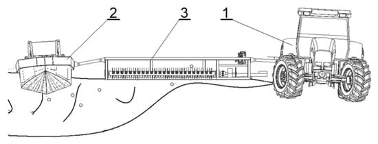 Available designs identified by the authors are characterized by the lack of possibility to clean the coastal and near-shore strip from pollution due to the used transport units of the working elements of the cleaning machines. The authors propose a solution consistent with the patent application P.429660 [65]. The solution according to the invention allows us to clean both coastal waters and sand beaches in the coastal strip, from algae and seaweed in particular, using a land vehicle and a motorboat for the movement (Figure 2).