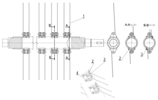 Working shaft of the cleaning machine: 1—torsion springs, 2—spring fixing screws, 3—mounting screws for spring mountings and 4—spring mounting.