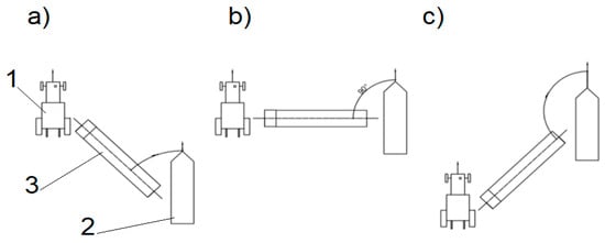 Possible position of the water unit in relation to the land unit: (a) delayed water unit, (b) water unit in optimal position in relation to the land unit and (c) overtaking water unit, where: 1—land unit, 2—water unit and 3—cleaning device.