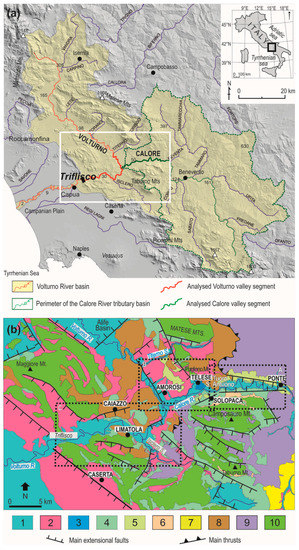 The upper and middle stretches of Volturno River flow through a wide valley that crosses the axial zone of the central-southern Apennine chain. The lower segment of the Volturno River crosses the northern sector of the Campania coastal alluvial plain which is part of the broad peri-Tyrrhenian Piana Campania Graben [38,39]. The sector of the southern Apennine chain that includes the middle Volturno River valley is part of a Neogene fold and thrust system generated by complex tectonic deformations started during the Miocene [40,41]. The tectonic units consist of carbonate platform and basinal Meso–Cenozoic sedimentary successions [42,43] (Figure 1b), which were progressively incorporated in the Apennine accretionary wedge [44]. This sector of the Apennine chain emerged since the Pliocene [45]. Starting from the Lower Pleistocene, it was affected by NW–SE extensional tectonics that generated high-angle fault systems mainly composed of NW–SE trending strike-slip and NE–SW trending normal faults, responsible for the onset of Quaternary fluvial and slope sedimentation [46]. In the Middle Pleistocene, a change in the direction of extension, from NW–SE to NE–SW, caused the reactivation of previous structures, especially those oriented in the NW–SE direction [32,47,48,49].