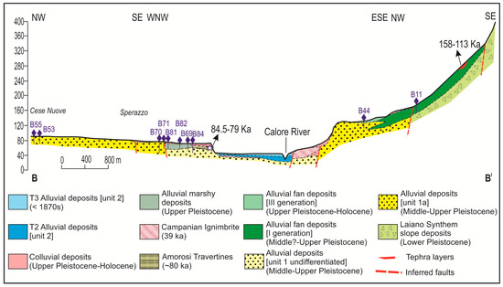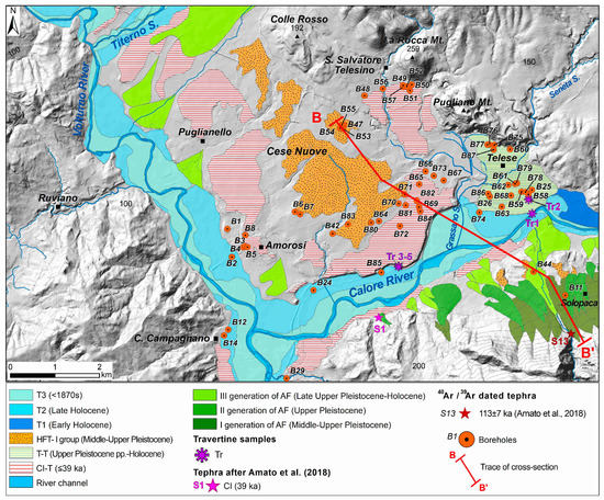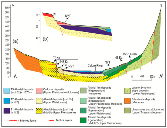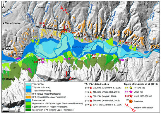 The oldest outcropping Quaternary deposits are preserved in the lower Calore valley (sectors A and B in Figure 1b). These are mainly terraced alluvial deposits, widespread on the northern valley slope, and slope and alluvial fan deposits prevailing on the southern slope. Among the latter, the oldest deposits are the tectonized and well-cemented Lower Pleistocene Laiano Synthem slope breccias [45], which are widespread along the northern slope of Camposauro Mt (Figure 1b). Alluvial fan deposits were found widely in the Calore valley and several generations have been distinguished by different authors [15,31,32,33,34,35], but without agreeing on the number of generations and related ages. In particular, Massa et al. [31], Di Bucci et al. [32,33] and Massa and Zuppetta [35] have distinguished two generations referred, respectively, to the Upper Pleistocene and the Early Holocene, while Magliulo et al. [34] highlighted the presence of three generations but without providing chronological constraints. Recently Amato et al. [15] highlighted the presence of four generations of superimposed or entrenched alluvial fan systems grown above the Laiano Synthem slope breccias. The first generation was chronologically constrained to the late Middle Pleistocene–early Upper Pleistocene, based on 158 ± 6 − 113 ± 7 ka 40Ar/39Ar dated tephra layers interbedded in its upper part. The second generation was referred to the Upper Pleistocene thanks to the presence of a 48 ± 7 ka 40Ar/39Ar dated tephra layer and a CI tephra layer (~39 ka) interbedded in the upper part. The third generation was constrained to the end of the Upper Pleistocene–Holocene based on the presence of a Neapolitan Yellow Tuff tephra layer (NYT hereinafter; ~15 ka [52]) in its upper part. Finally, the fourth generation was referred to the Holocene.