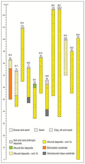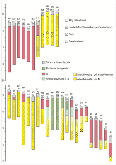 Alluvial unit 1a mainly consists of polygenic, heterometric, predominantly well-rounded pebbles, poorly cemented, with scarce to abundant silty-sandy and/or silty-clayey yellowish matrix, and lenses and layers of coarse to medium sands (few decimeters to some meters thick) (Figure 5a,b). Horizontal bedding imbrications are locally present in gravels levels and reddish erosion surfaces often mark the contact between sandy levels and gravels. In addition, the borehole successions highlight the presence of fine-grained intervals, containing beds of blackish organic substance and/or peaty layers. The overall textural characteristics of these deposits suggest a braided stream environment.