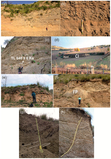 Our field surveys have evidenced, in agreement with other authors [15,32,33,34], that high-angle faults have displaced the alluvial unit 1a and HFT-I group (Figure 5f–h). These faults also controlled the development of the rectilinear, about 25 m high fluvial scarps that terraced the HFT-I group. At the foot of these scarps, the HFT-II group and related alluvial unit 1b are found (Figure 4a).