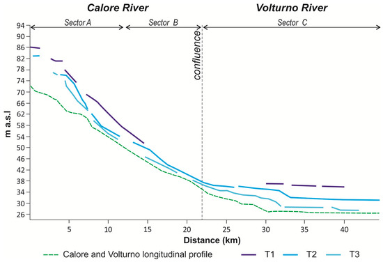 In sector A, these terraces are steeper and convergent along the first 7.5 km of the longitudinal profile of the Calore River (Figure 6), then show gentler gradients and remain approximately parallel. Average slopes slightly decrease from T1 to T3 (Table 3).