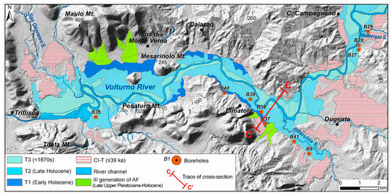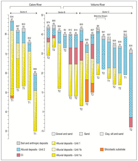 Alluvial valley floor deposits present downstream the Calore confluence (sector C in Figure 1b) are referred to the Upper Pleistocene–Holocene Limatola Synthem [45]. They consist of sandy silts and sands of prevailing pyroclastic nature, with carbonate or polygenic gravelly lenses. Near the Calore confluence, Massa and Zuppetta [35] distinguished within these deposits two orders of fluvial terraces that they referred, respectively, to the Upper Pleistocene and the Holocene.