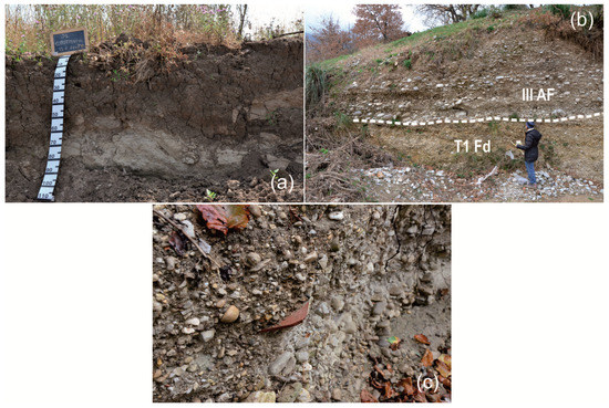The third generation of AF, unlike the other two, is present also on the right Calore valley side (Figure 4a) and corresponds to the fourth generation of Amato et al. [15]. It consists of alluvial fans made of gravelly-sandy deposits with heterometric, sub-angular to sub-rounded pebbles, containing paleosols, archaeological remains and recent anthropic artifacts (Figure 8c). The deposits of this generation of AF cover T1 and T2 terraces and, in some places, interfinger with the T2 deposits (Figure 4b). This generation of AF is chronologically constrained to the Holocene.