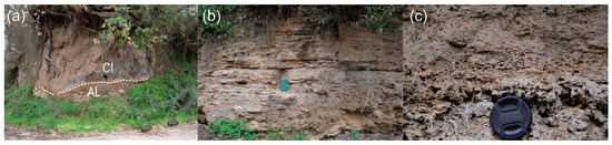 Locally, paleosols and tephra layers are intercalated in unit 1a. In particular, at Masseria Acquafredda (S16 in Figure 2; Figure 5c) a 30 cm-thick yellow-brownish 648 ± 6 ka 40Ar/39Ar aged tephra layer [15], most likely corresponding to the pyroclastic layer dated to 674 ± 10 ka by Di Bucci et al. [33] (S17 in Figure 2), is interbedded in these deposits (Figure 4a). Furthermore, unit 1a contains the 560 ± 2 ka aged ignimbrite deposit of Magliulo [30] and the 97 ± 25 ka aged tephra layer of Di Bucci et al. [33] (Figure 2 and Figure 4a). Therefore, a Middle–Upper Pleistocene age between ~650 ka and ~97 ka can be assumed for this unit and the HFT-I group. This age is also supported by the presence of the CI (~39 ka) pyroclastic flow deposits (Figure 4a and Figure 5d) filling the V.ne Ariola stream valley, which deeply cuts the HFT-I group, confirming that its formation took place long before the CI deposition.
