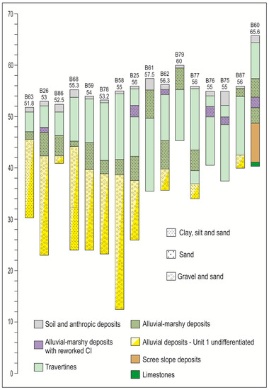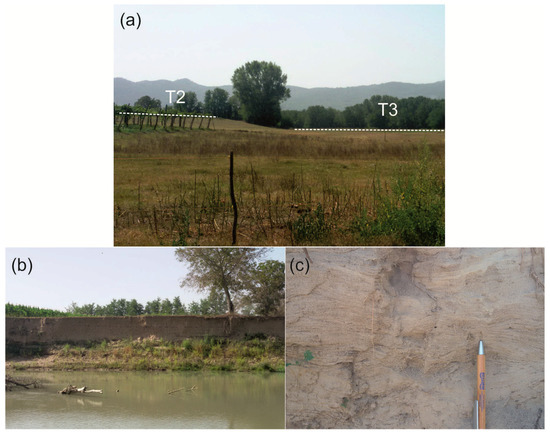 Only the uppermost layers (~30 cm) of the deposits forming these three terraces are directly observable. They consist of loose sandy silts with gravels and include reworked terracotta pebbles in T3. Some more information was obtained for T1 by examining borehole data. The deposits forming T1 (alluvial unit 2 in B87, B33, B32, B88; left to right in Figure 7) are 5 to 9 m thick and rest above Middle–Upper Pleistocene, up to ~35 m thick alluvial deposits (unit 1 undifferentiated and unit 1b in Figure 7) and consist of both fine and coarse sediments. Fine sediments consist of silts, sandy-silts, silty-sands, and silty-clays with plane-parallel lamination (B87 and B33, left to right in Figure 7), sometimes including polygenic pebbles in the upper part, while coarse deposits essentially consist of loose clast-supported heterometric and predominantly rounded carbonate pebbles (B32 and B88, left to right in Figure 7).