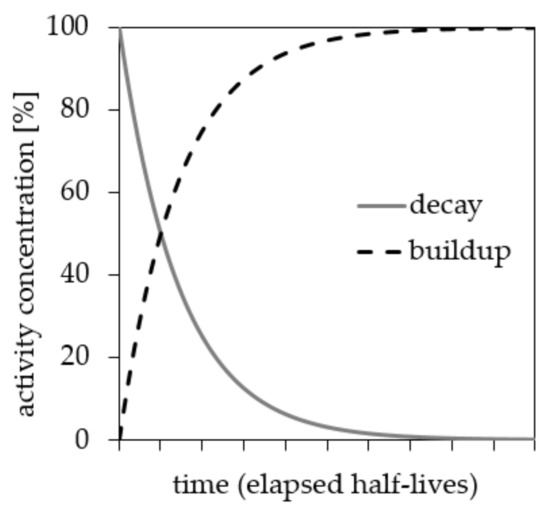 Both concepts are based on the general decay law, which sets the activity concentration that develops with time (Ct) in relation to the input concentration (C0) as a function of the elapsed time (t) and the nuclide-specific decay constant (λ) (Equation (1)).